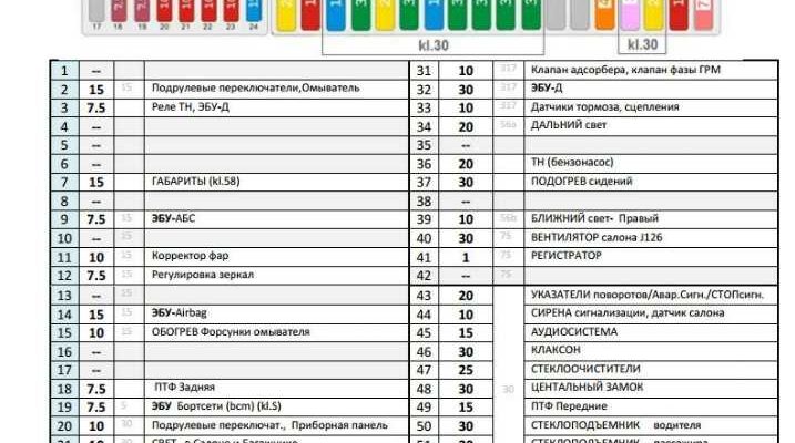 - Система обогрева: Если не функционирует обогреватель, следует проверить соответствующий элемент на 30А. Часто происходит его сгорание из-за перегрева.
